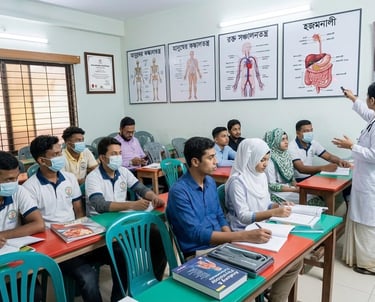 An MBBS doctor explaining anatomy to attentive paramedical students.
